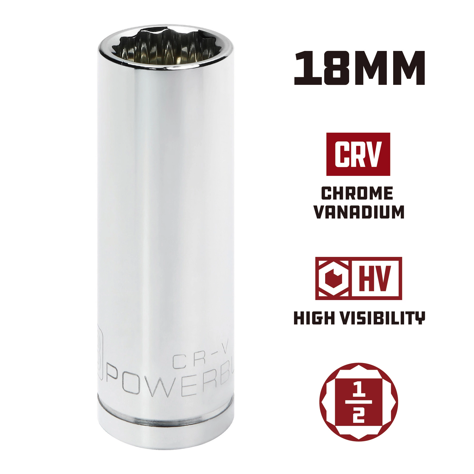 - Powerbuilt chrome sockets feature HV high visibility size markings that are three times larger for easy size selection.