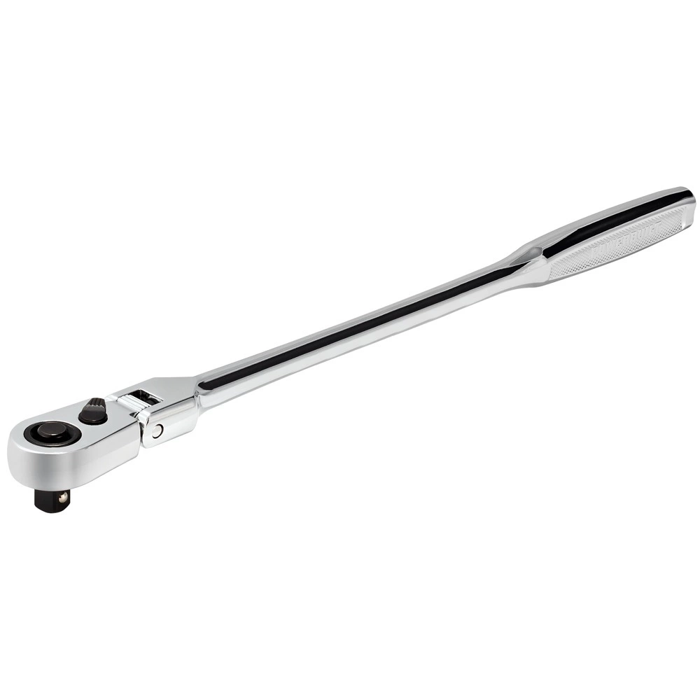 Powerbuilt Professional Technician ratchets are constructed of high-quality Chrome Vanadium (CR-V) steel with a mirror-polished chrome-plated finish and are precision crafted to exceed ANSI standards for quality and performance. The sealed quick-release button blocks dust and debris and makes socket changes quick and easy. The long reach contour handle fits flat in the palm of the hand adding both comfort and leverage and the thin-profile flex head allows you to swivel the ratchet head up to 180° making it easier to reach into those crowded spaces. These ratchets offer the look, feel and performance hard-working techs deserve.