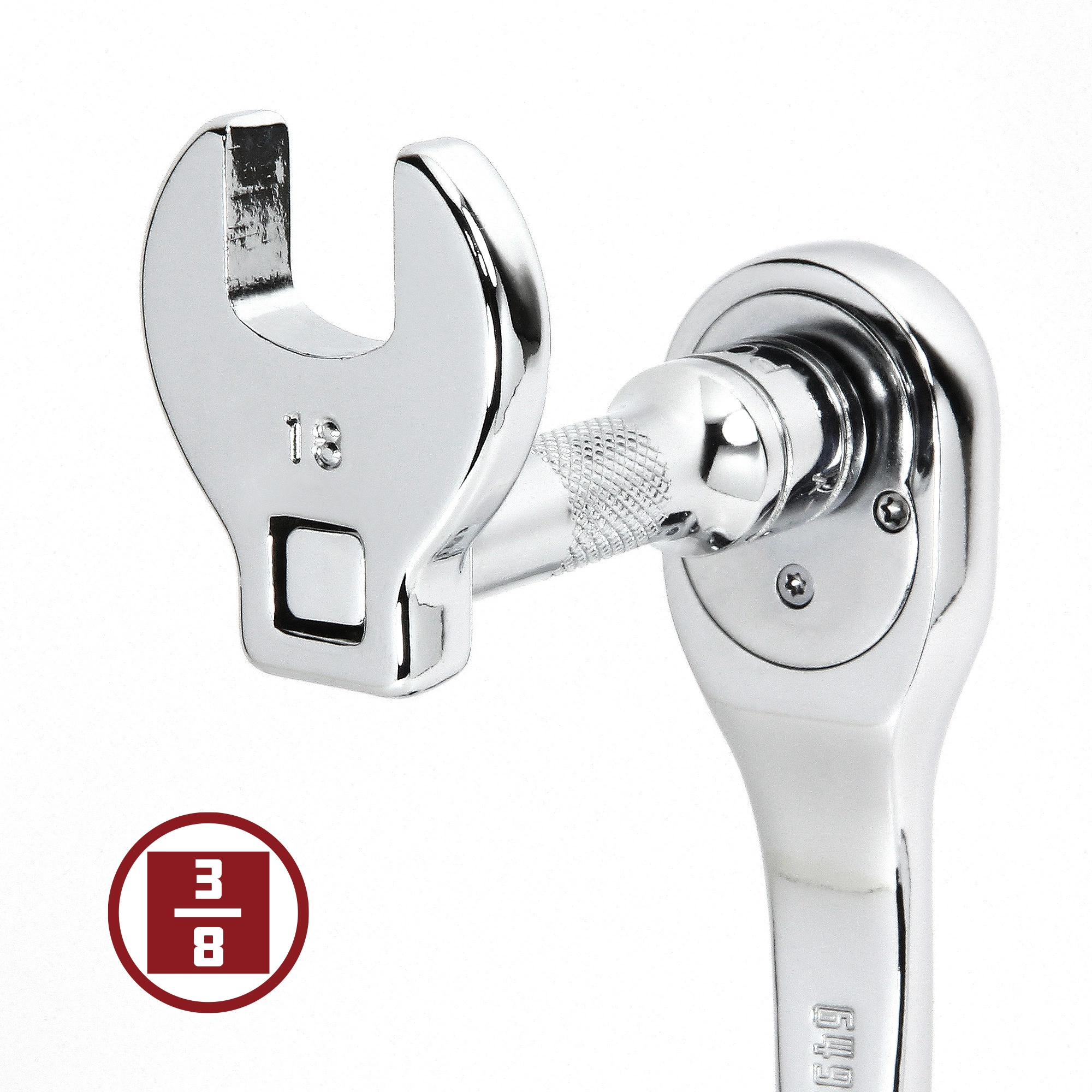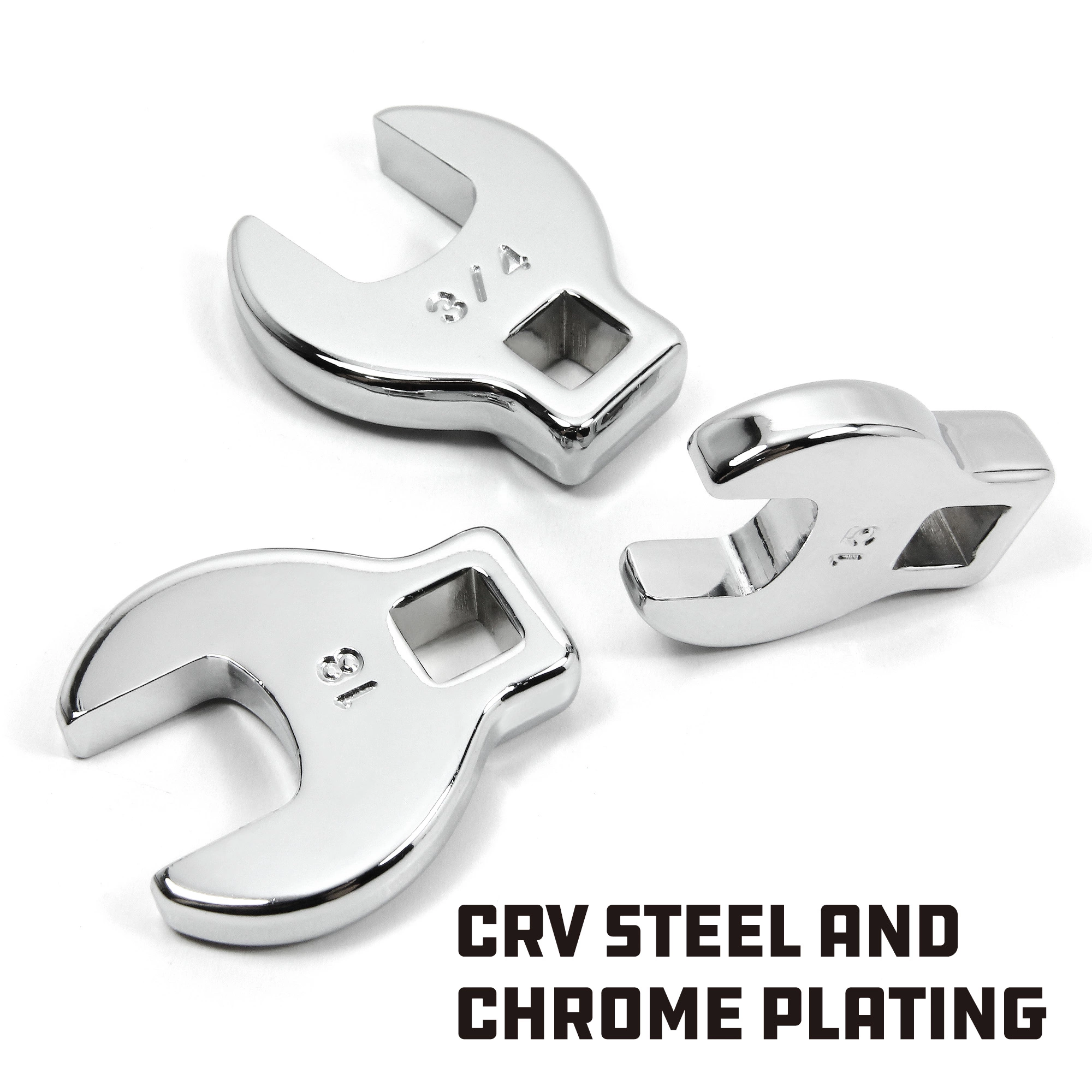 Increase your tool kit and take advantage of the added reach and speed of ratcheting open-ended wrenches. The Powerbuilt 10 Piece 3/8 Inch Drive SAE and Metric Crowfoot Wrench Set can do all this for you while saving you space in the tool bag or workbench. Convert any 3/8 inch ratchet or bar into 10 different open-end wrenches with this crowfoot wrench set. The set includes SAE and Metric wrenches in the most common sizes; 7/16 inch, ½ inch, 9/16 inch, 5/8 inch, 3/4 inch, 10mm, 13mm, 15mm, 16mm, 18mm. Wrenches are made from premium chrome vanadium steel with a chrome-plated mirror finish for durability and long tool life. This set is precision-built to meet or exceed ANSI standards.