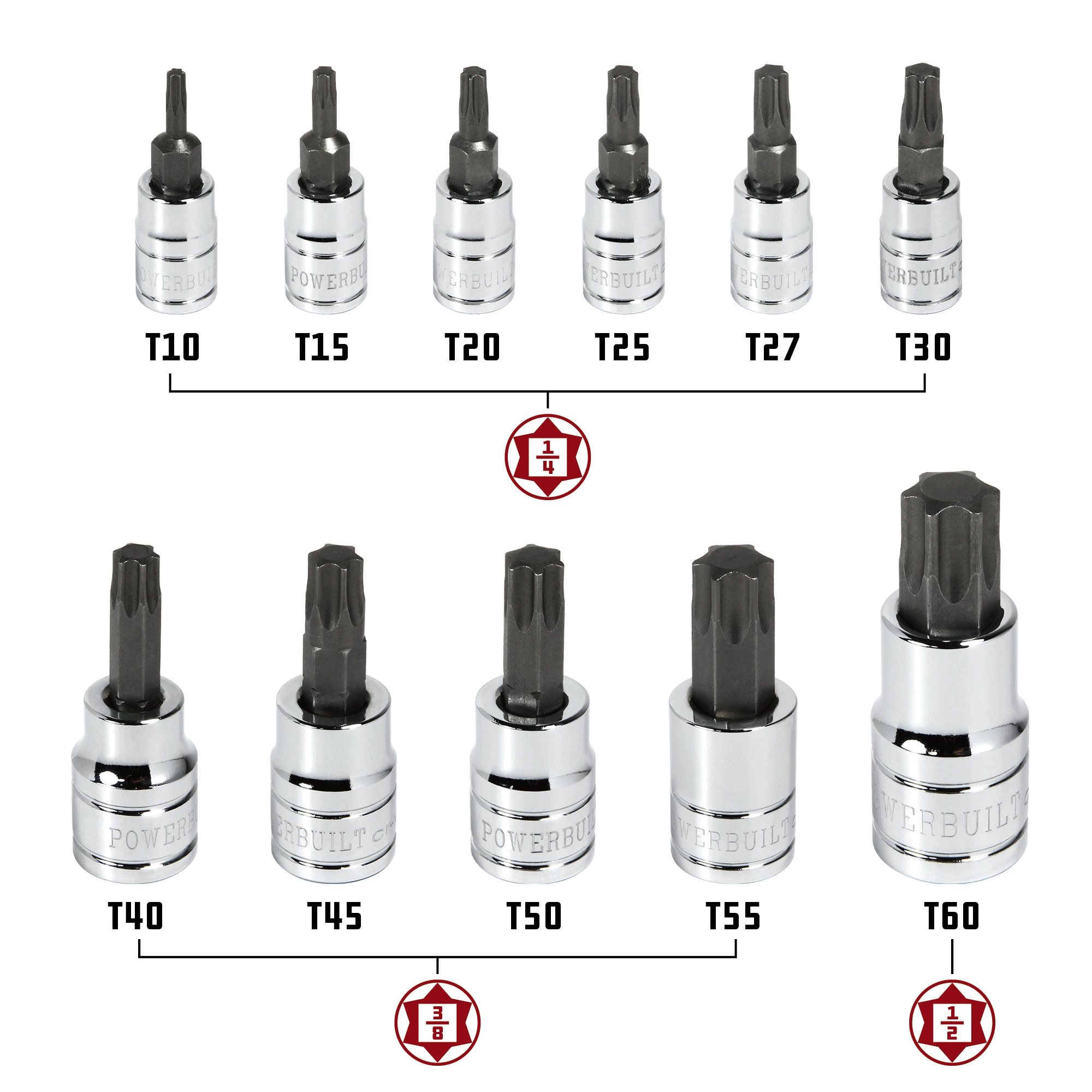 This 12 piece set contains the following Star Torx bit sockets: 1/4-in Drive: T-10, T-15, T-20, T-25, T-27, T-30; 3/8-in Drive r: T-40, T-45, T-50, T-55; 1/2-in Drive: T-60. Meets or exceeds ANSI standards. Lifetime warranty.