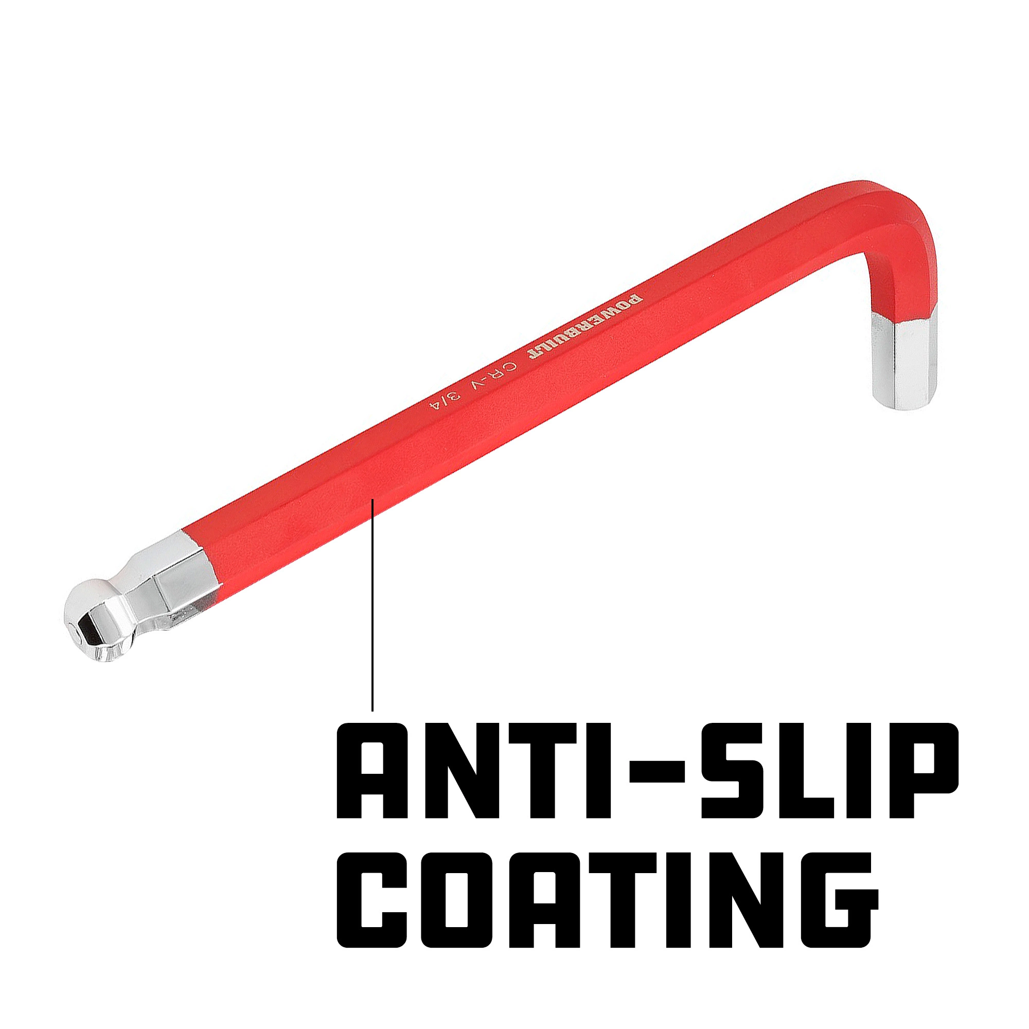 This top quality long arm SAE hex key wrench set offers strength, style and precision. Each wrench is constructed of premium chrome vanadium steel for durability and precise fit into SAE hex head fasteners. A durable powdercoat finish adds protection and color-coding while the ball end drives fasteners from angles up to 25 degrees from vertical. And the wrench ends are magnetized for easier fastener start up and removal.
