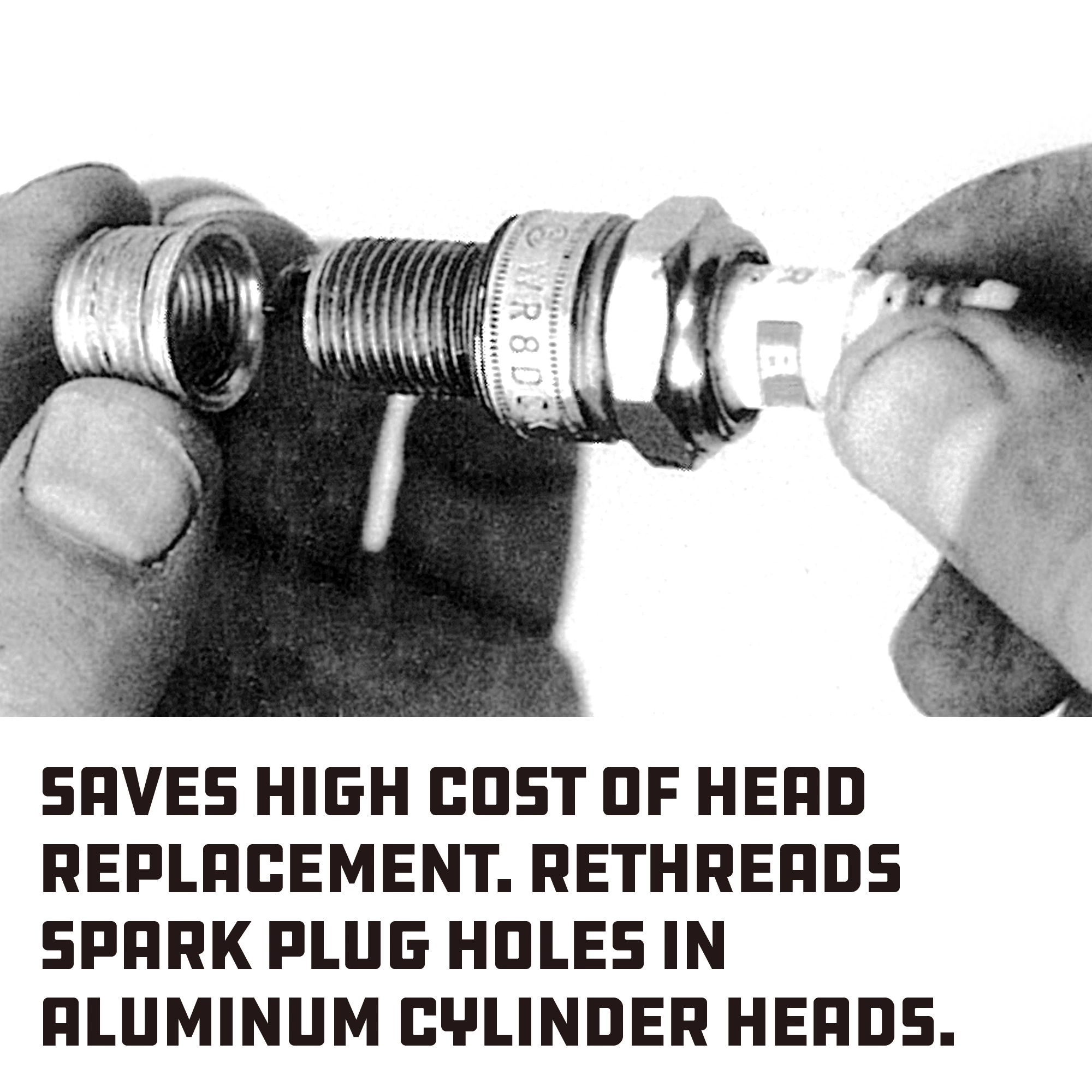 Rethreads damaged 14 millimeter spark plug holes in aluminum heads. Includes tap and 4 inserts: two 7/16″, one 5/8″ and one 13/16″. Meets or exceeds ANSI standards. Lifetime warranty.
