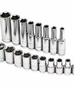 The Powerbuilt 18 piece 1/4″ Dr. SAE 6 point socket set includes: shallow sockets: 5/32″,3/16″, 7/32″,1/4″, 9/32″, 5/16″,11/32″, 3/8″, 7/16″, 1/2″; deep sockets: 5/32″, 3/16″, 7/32″, 1/4″, 9/32″, 11/32″, 7/16″, 1/2″.