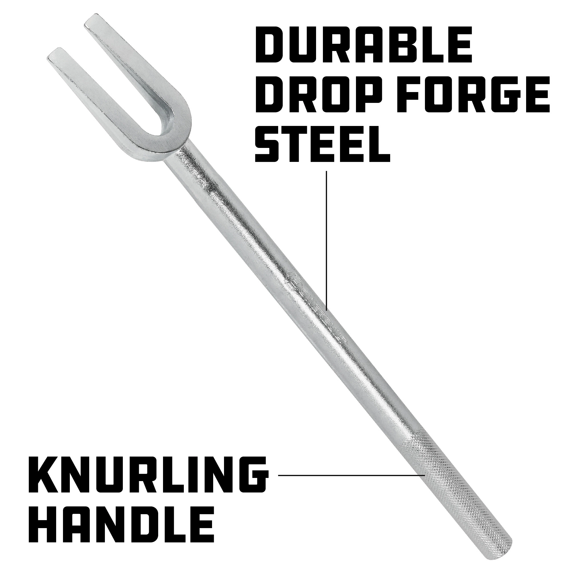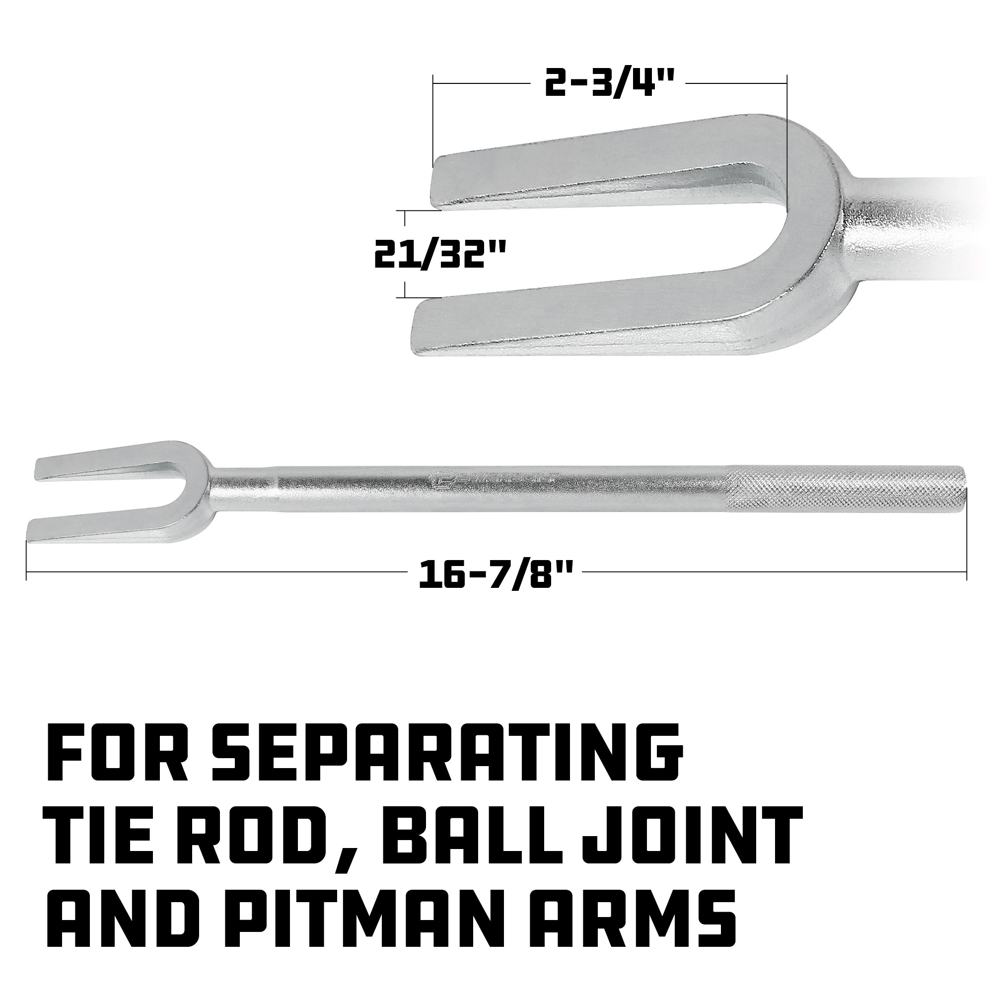 Drop-forged, heat-treated alloy steel wedge tool for separating tie rod ends. 21/32-in tine opening. Meets or exceeds ANSI standards. Lifetime warranty.
