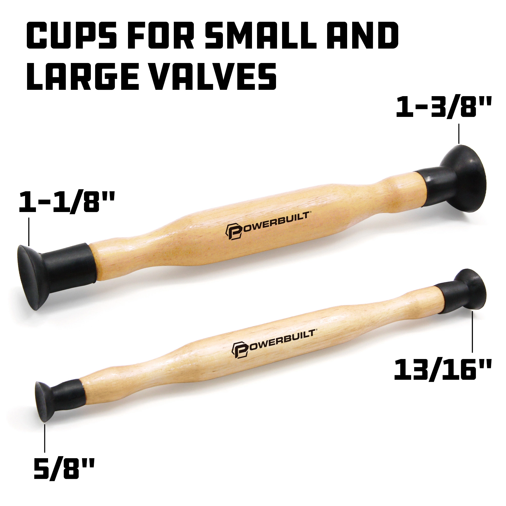 This Powerbuilt double cup valve grinder set is perfect for hand lapping valves and valve seats. Includes a 9″ tool with 1-1/8″ and 1-3/8″ cups and an 8″ tool with 5/8″ and 13/16″ cups.Valve lapping ensures an air-tight seal between the valve and valve seat. The high quality synthetic rubber cups are chemical resistant and built to last.These non-slip cups are groove-locked to the tool’s hardwood handle.Any automotive specialty tool makes an automotive repair or maintenance task easier, but Powerbuilt takes the concept of ‘help’ a big step further.Every package comes with professionally written usage instructions and photos that take you step by step through proper tool usage.Dependable Powerbuilt specialty tools offer power, precision and style. They meet or exceed applicable ANSI standards and have a lifetime warranty, all at affordable prices.