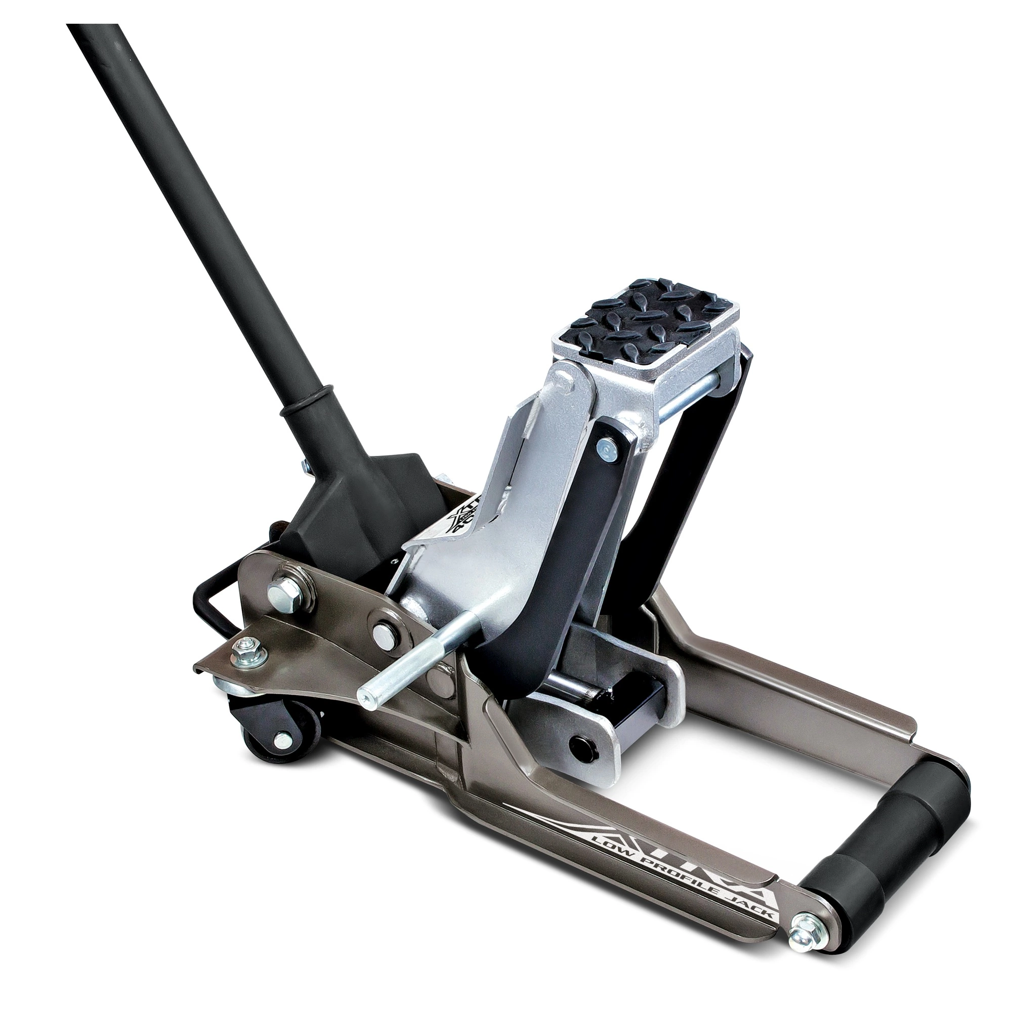 XTRA LOW: The Xtra Low Profile starting height of 2-3/4 inches is perfect for hot rods, modified sports cars, lowered vehicles, and exotics. Works perfectly on Porsche, Corvette, Mercedes, etc. SAFETY: The Locking Safety bar allows the jack to lift and hold in 1 spot keeping the vehicle safely lifted on the jacks mechanical structure and not relying on the hydraulics while working under the vehicle. Eliminates the need for using Jack stands with the jack. PORTABLE: The jack comes with a convenient carrying handle on the back end of the jack making it easier to transport and maneuver. CAPACITY: Max capacity is 2 tons (4000 lbs) LIFT RANGE: From 2-3/4 inches to a maximum height of 15-1/2 inches