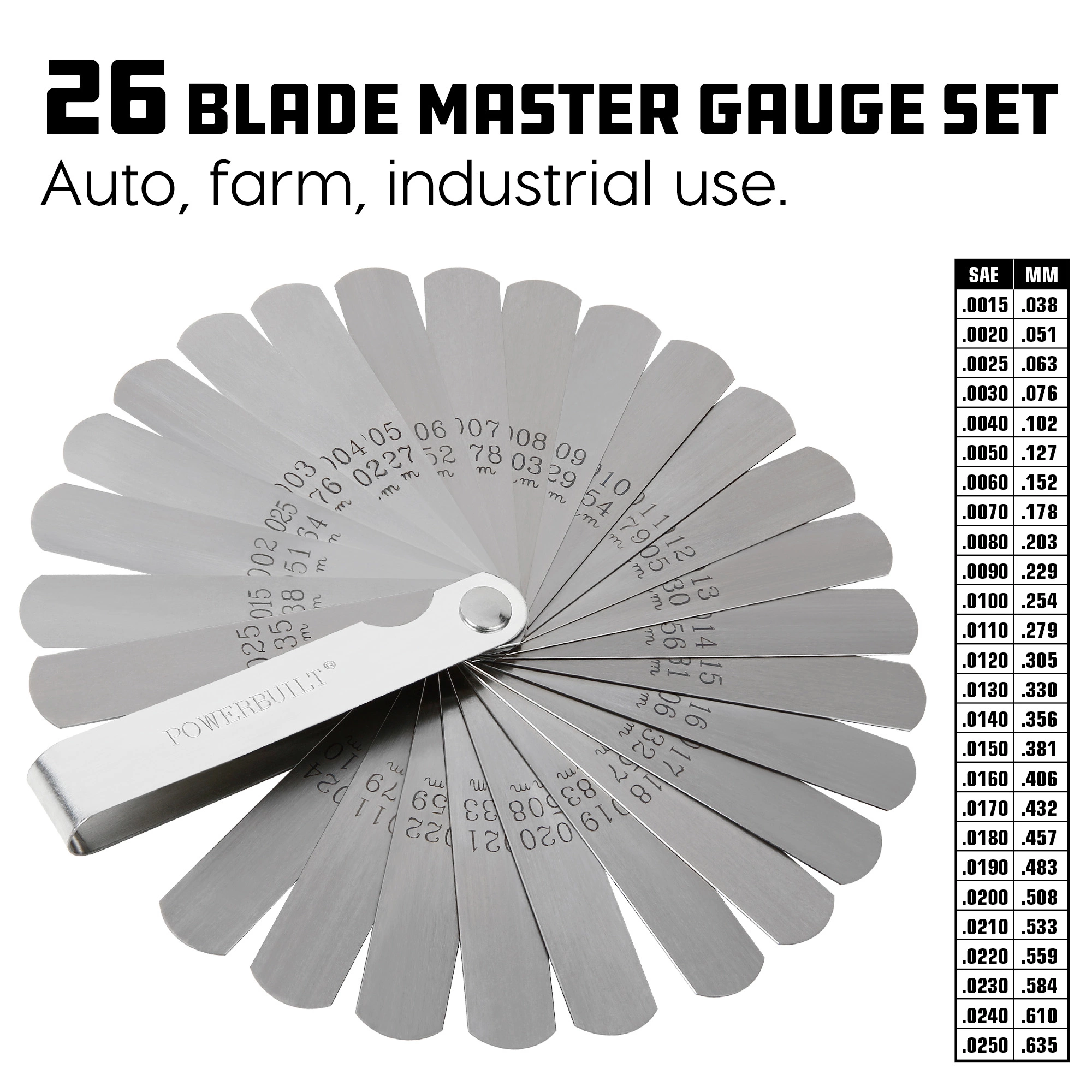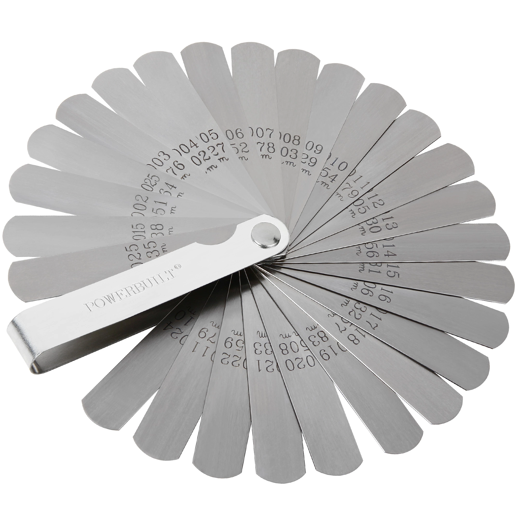 Use the Powerbuilt 26-blade master feeler gauge to measure gap clearances up to 0.025″ (0.635mm) with confidence. This master set includes the following blade sizes, with both metric and standard measurements: 0.0015″, 0.002, 0.0025, and 0.003″ – 0.025″ in 0.001″ increments. Meets Meets federal specification GGG-G-17c for general purpose gauges.Any automotive specialty tool makes an automotive repair or maintenance task easier, but Powerbuilt takes the concept of ‘help’ a big step further.Every package comes with professionally written usage instructions and photos that take you step by step through proper tool usage.Dependable Powerbuilt specialty tools offer power, precision and style. They meet or exceed applicable ANSI standards and have a lifetime warranty, all at affordable prices.