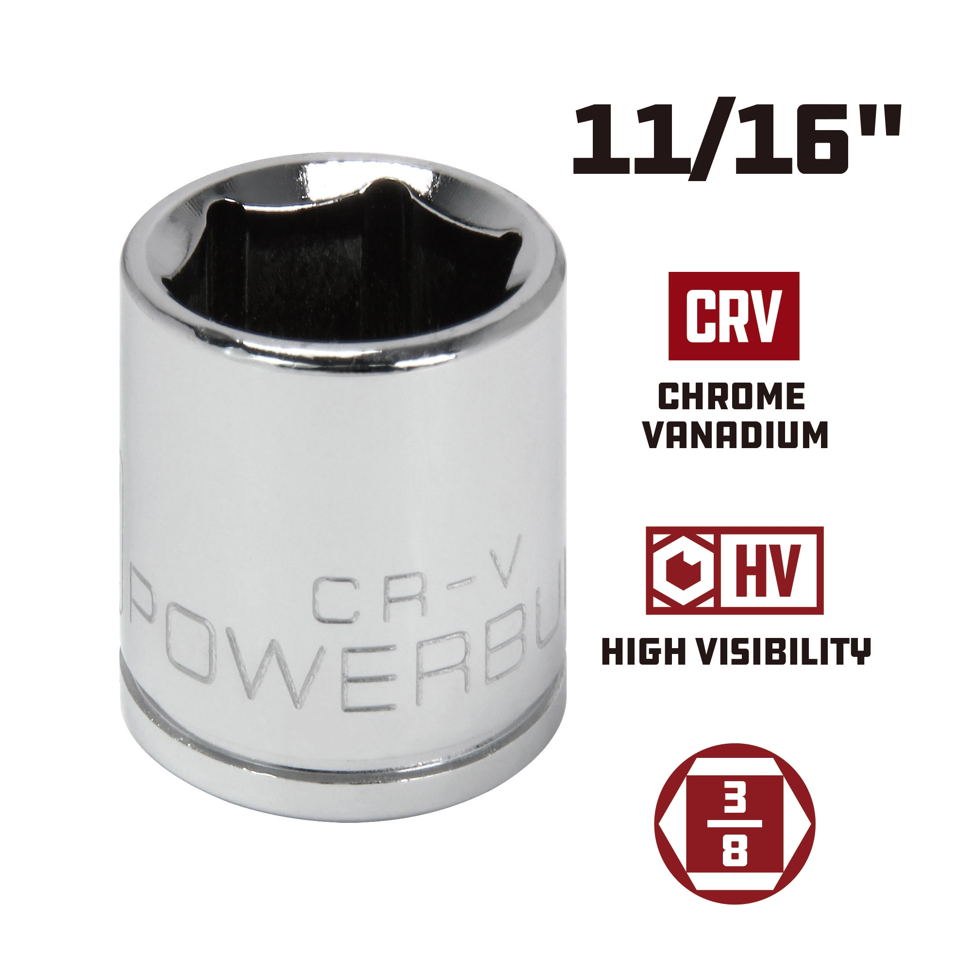 - Powerbuilt chrome sockets feature HV high visibility size markings that are three times larger for easy size selection.