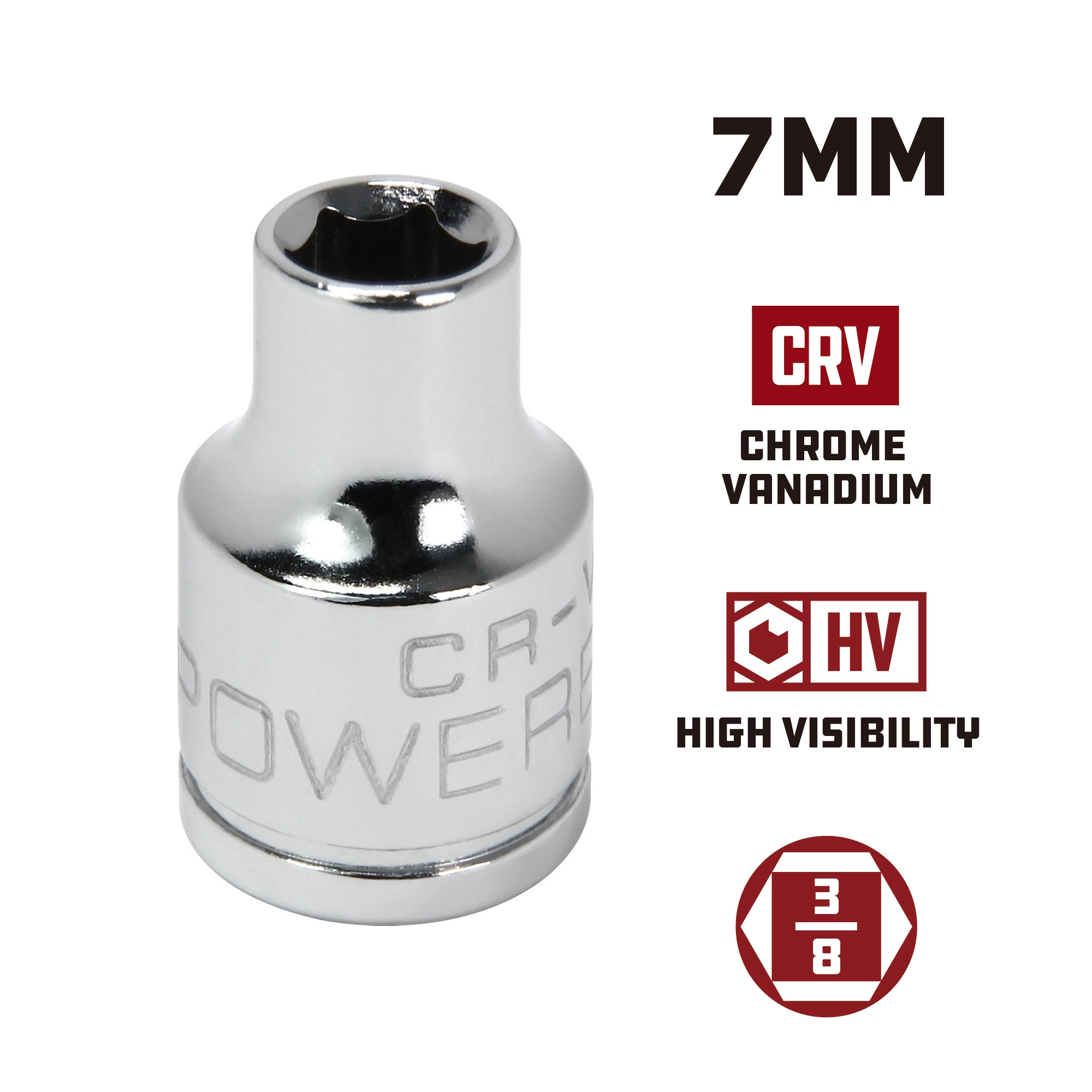 - Powerbuilt chrome sockets feature HV high visibility size markings that are three times larger for easy size selection.