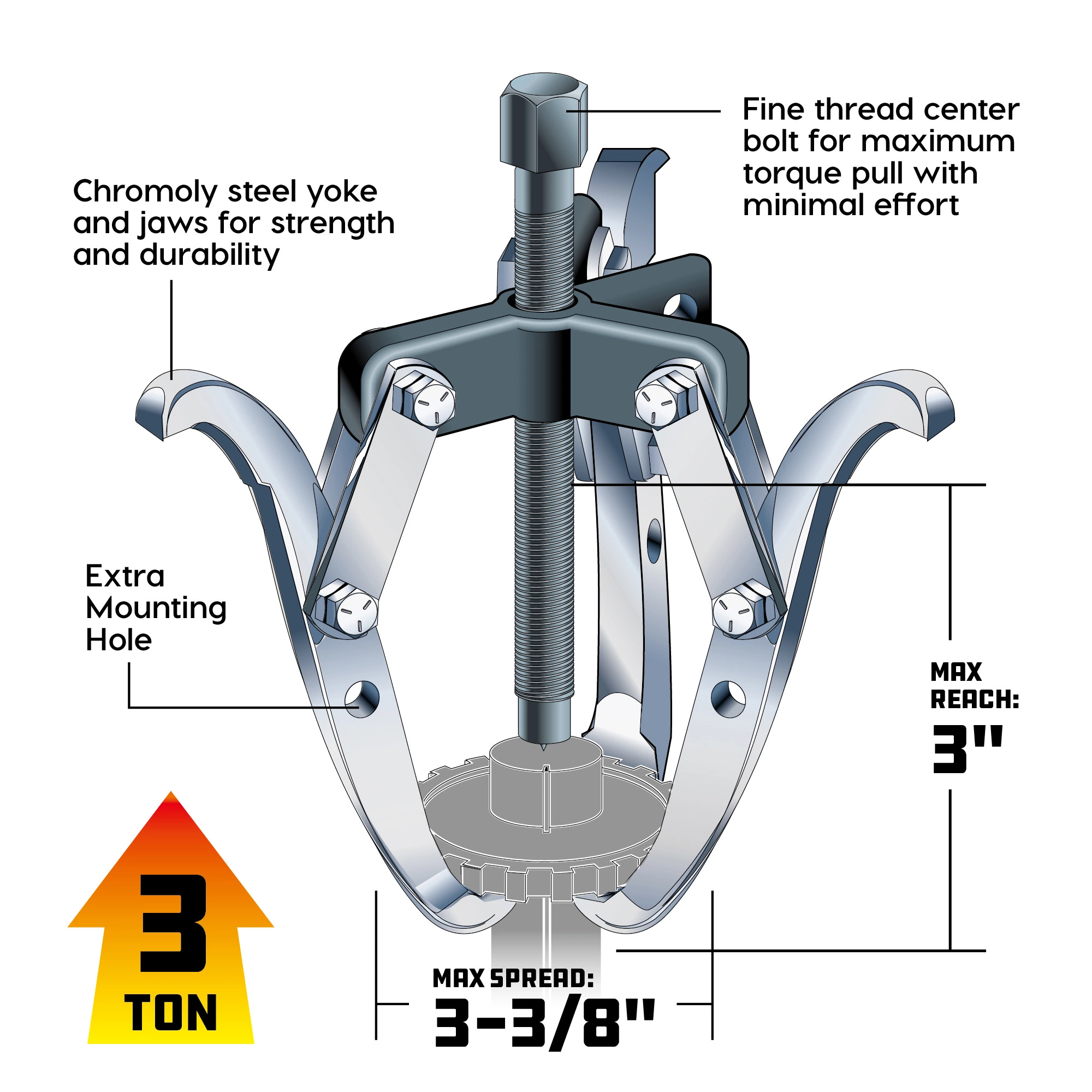 For pulling gears and pulleys. 3-in reach, 3-3/8-in spread, 3-ton capacity. Heavy duty drop-forged and heat-treated yoke and jaws. Can be used with either two or three jaws. Jaws reverse for inside or outside pulls and reverse end-to-end for different depths of pulls and different” size hooks. Chrome and black oxide finish. Kit includes blow-mold storage case. Meets or exceeds ANSI standards. Lifetime warranty.