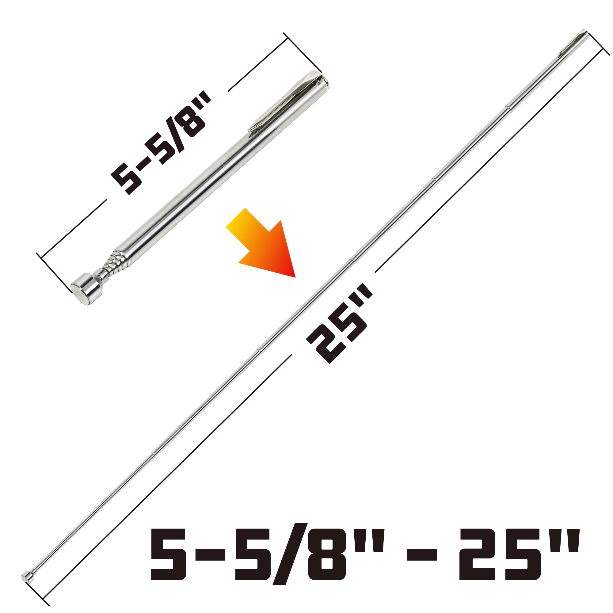 –Handy pickup tool telescopes to 25 inches long to reach dropped nuts, bolts, washers and parts