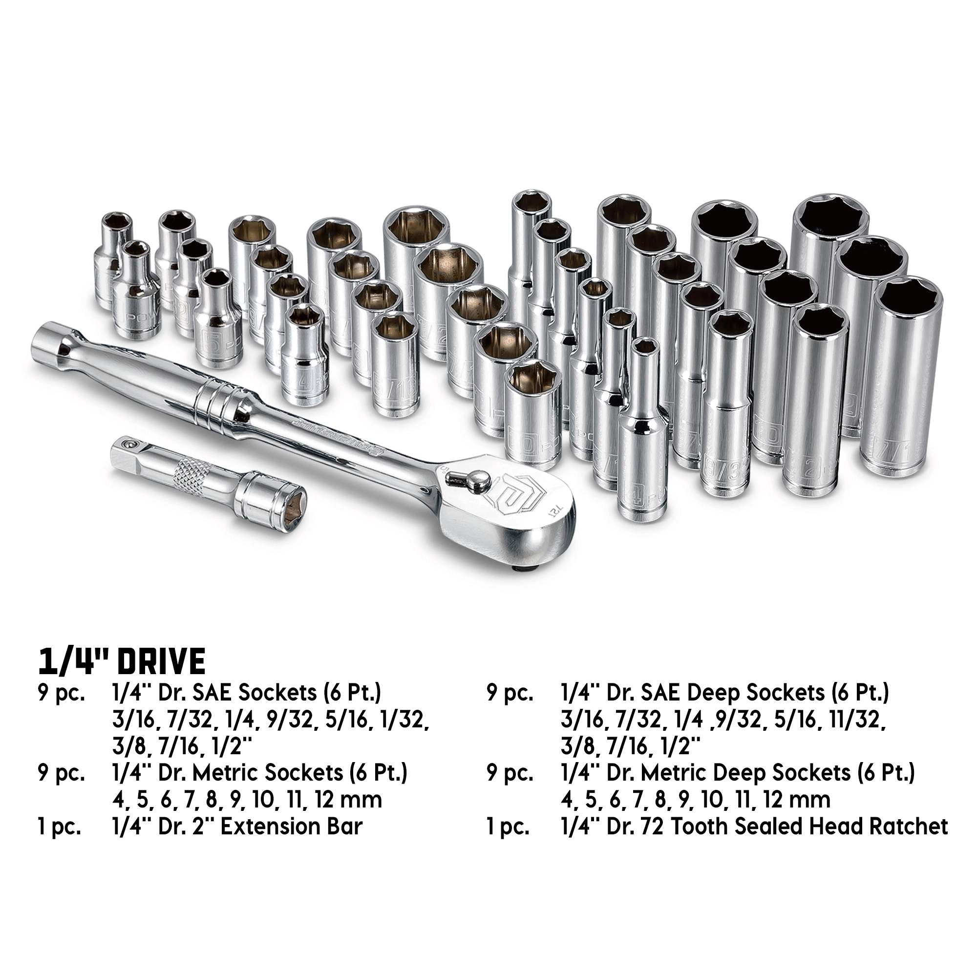 Master mechanics and hobbyists alike demand their tools have the highest quality materials and precision manufacturing. With this in mind, Powerbuilt created the 38-Piece 1/4 inch Drive Mechanics Tool Set. All tools are made from professional-grade materials and designed and produced with the precision and quality required of professional mechanics. The Mechanics tool set includes a robust selection of common-sized sockets in shallow and deep styles in both SAE and metric sizes. A 72 toothed sealed head ratchet with a 5-degree swing for smooth action and better torque in those hard-to-reach spaces. And a 2-inch extension bar to further extend the reach in tight spaces. Made from Chrome Vanadium (Cr-V) steel, with mirror polished plated finish for durability, and corrosion resistance these tools are assured a long tool life. This set comes in a protective heavy-duty blow mold carry case for easy organization and transportation of tools.