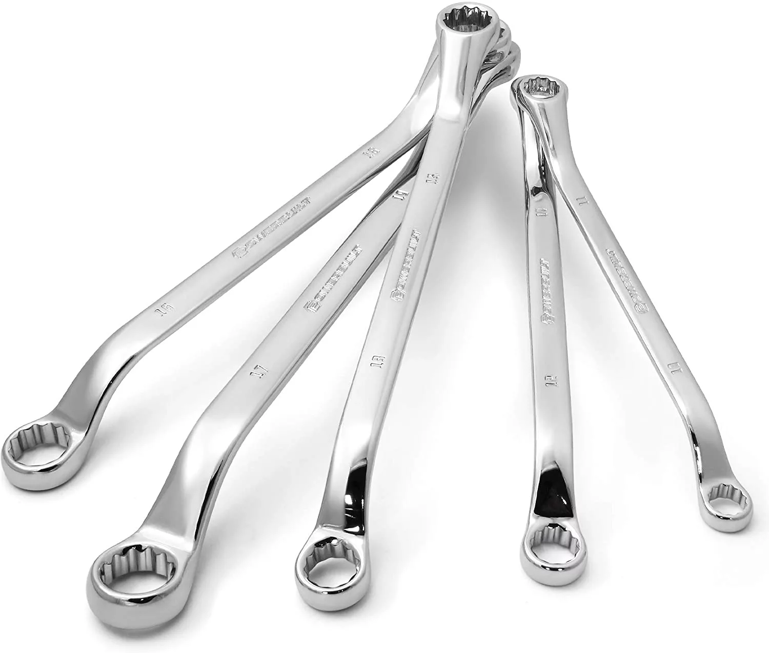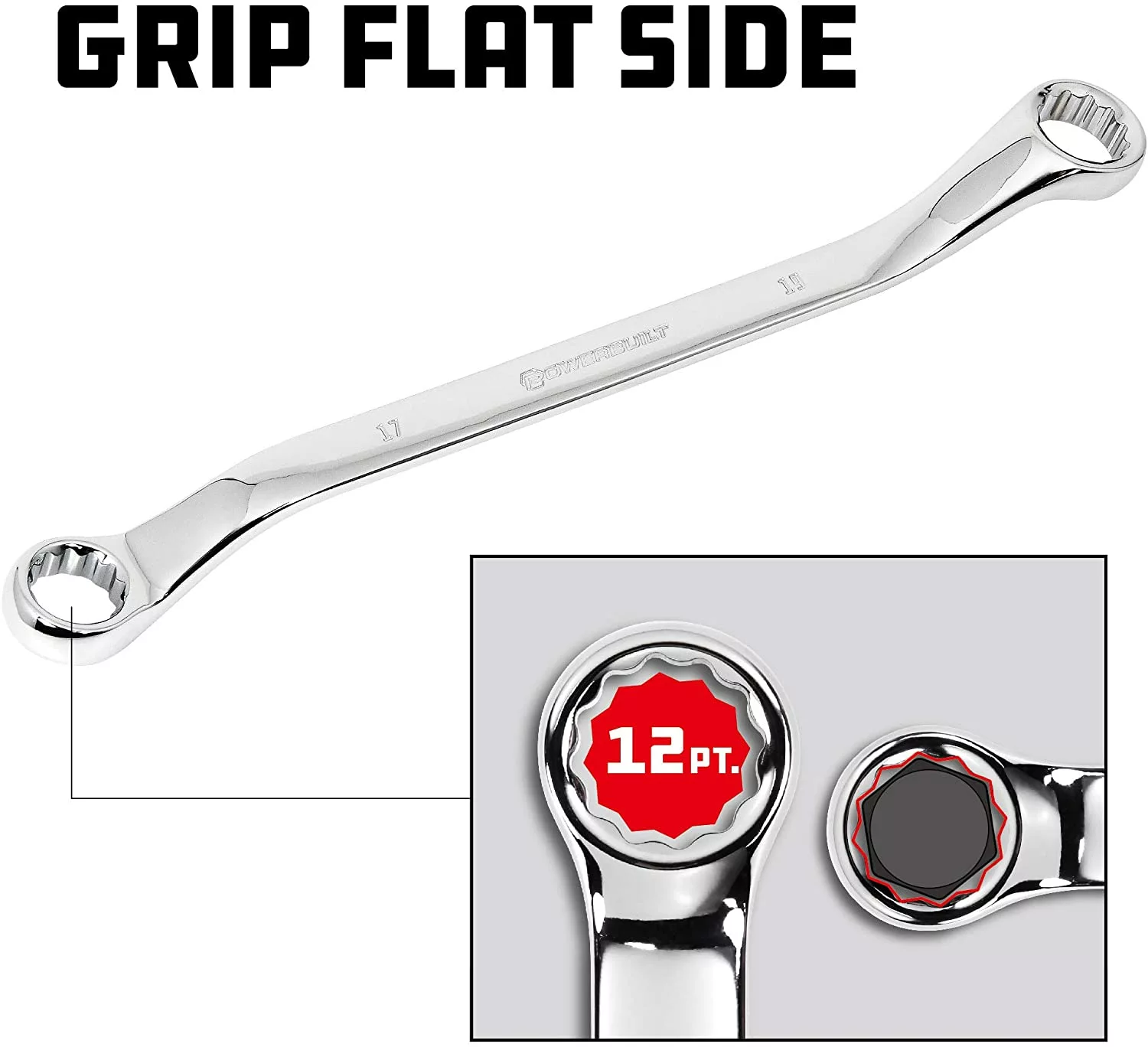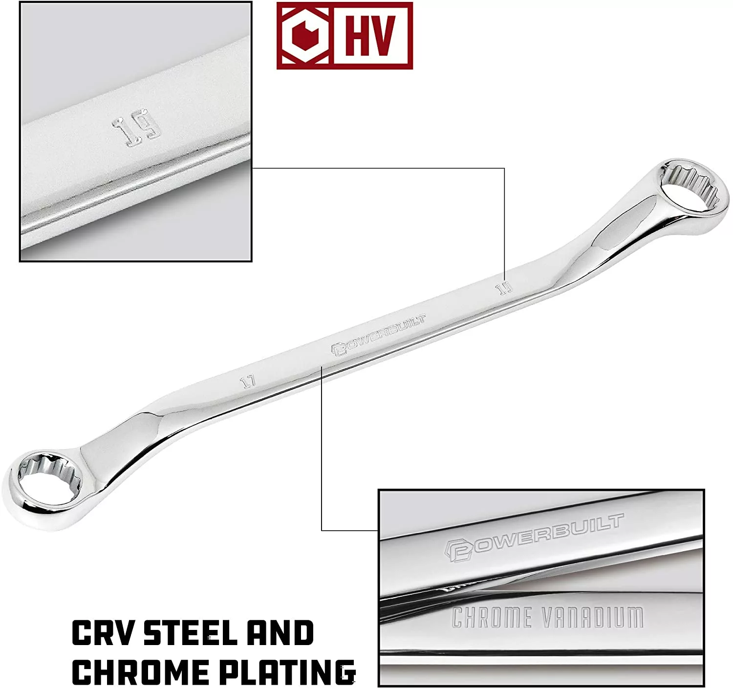 The Powerbuilt 5 Piece Metric Offset Double Box-End Wrench Set is constructed of premium chrome vanadium steel for unsurpassed strength and performance, and mirror polished for a touch of style. The 45-degree offset handles make it easier to reach around obstructions in tight engine compartments. Z-Drive hex design on the box ends contact the flat walls of fasteners instead of the corners for stronger grip and less chance of round off. Precision built and affordable, Powerbuilt products meet or exceed ANSI standards.