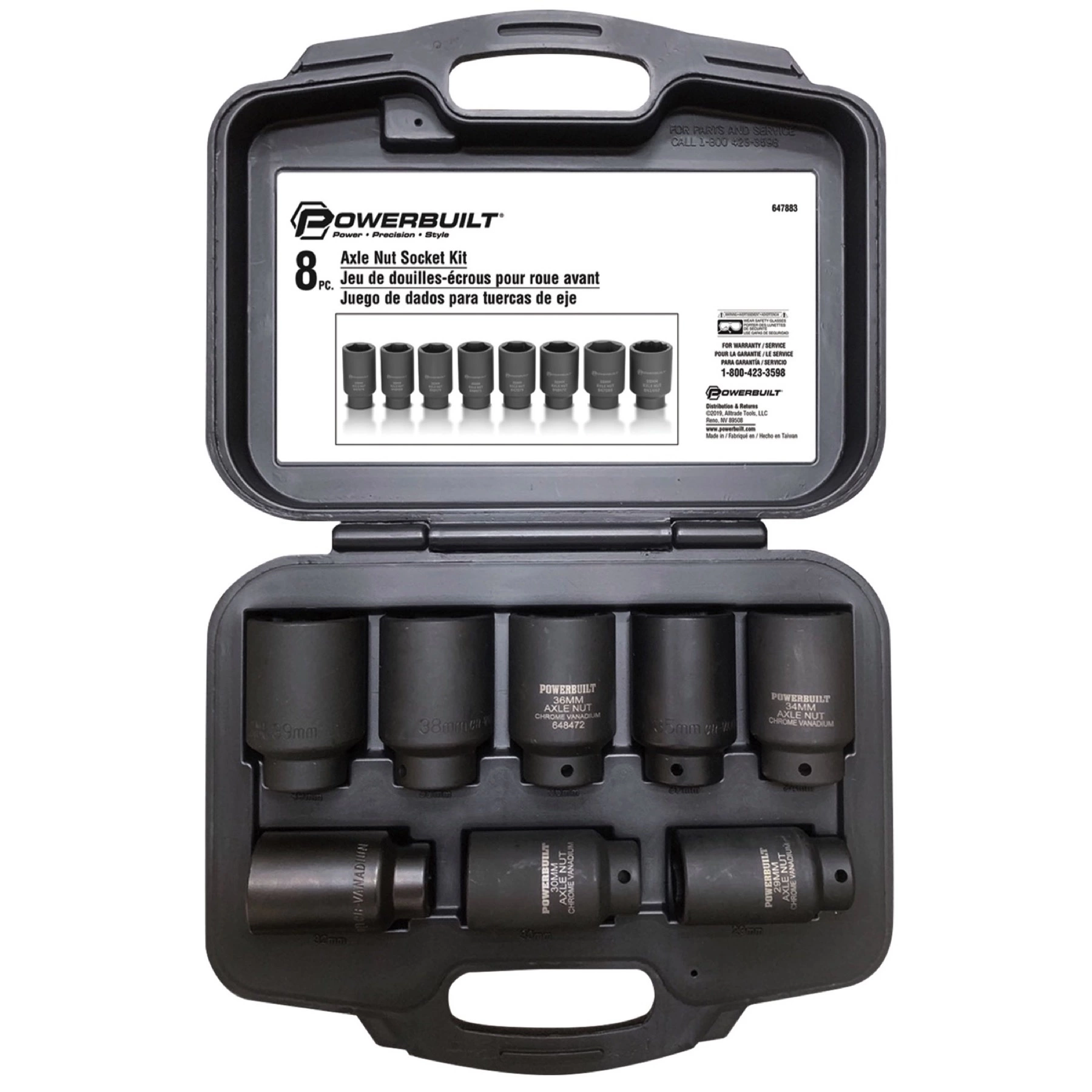Powerbuilt 8-piece Master Axle Nut Socket Set is specifically designed for the removal and installation of 6 point axle nuts on most vehicles. This set is built to last a lifetime with impact-rated, 6-point chrome vanadium sockets and contains, 29mm, 30mm, 32mm, 34mm, 35mm, 36mm, 38mm, 6 point sockets, and a 39mm 12 point socket to cover almost all axle nut applications. Deep sockets are designed to ensure fitment on a variety of axle lengths. Kit Includes Heavy Duty Carry Case with usage photos and Detailed instructions.