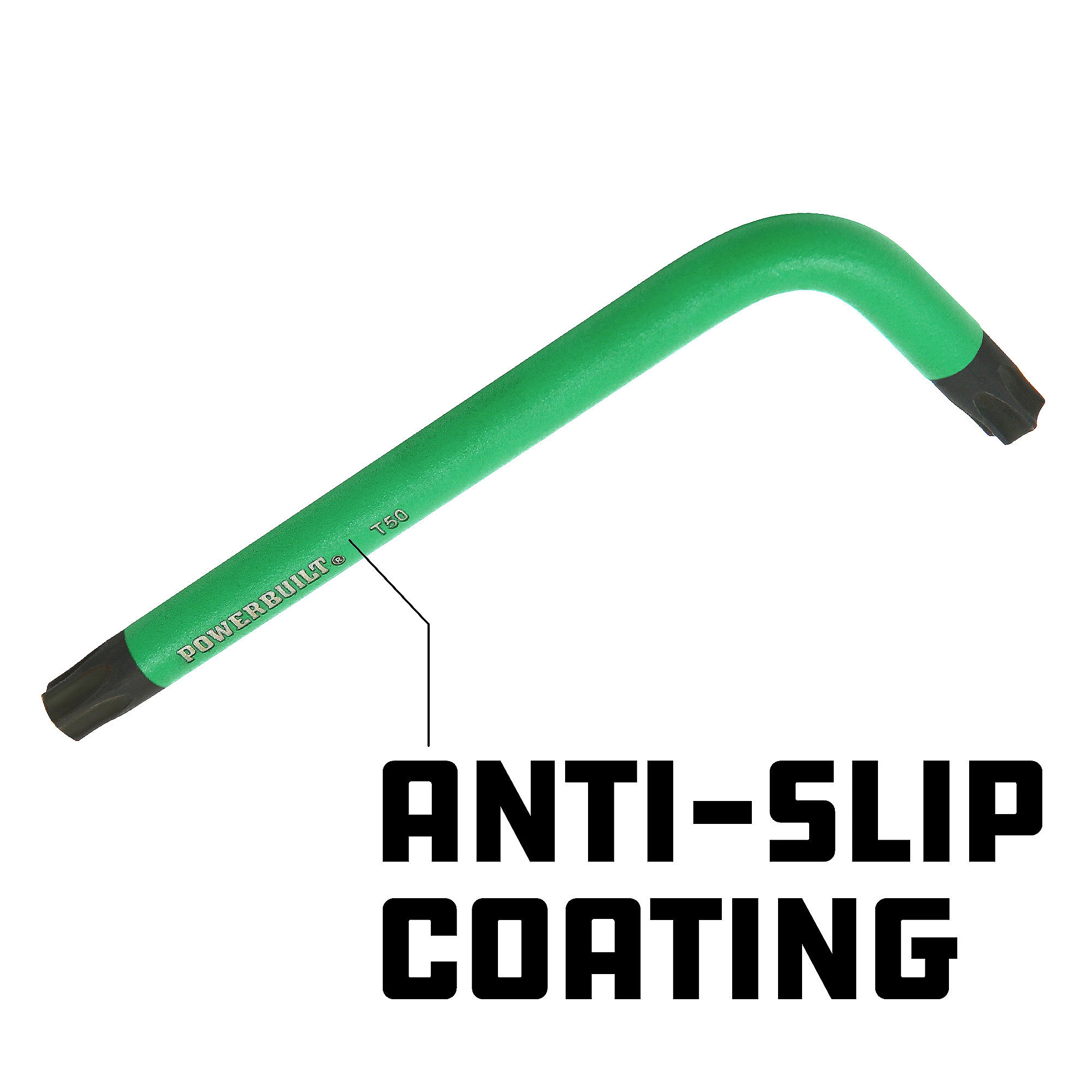 The Powerbuilt 9 Piece Short Arm Tamper-Proof Torx Key Wrench Set is a top-quality key wrench set offering strength, precision, and organization. Each wrench is constructed of premium hardened S2 steel for durability and black phosphate ends for a precise fit into Tamper-Proof Torx head fasteners. The short arms allow for reaching into tighter spaces and easier storage in the toolbox. Set includes wrench sizes T-10, T-15, T-20, T-25, T-27, T-30, T-40, T-45, and T-50. The 9 key wrenches are organized with size markings inside the included fold-out plastic carrier you can hang on pegboard or toss in a toolbox. Powerbuilt products meet or exceed ANSI standards. Dependable enough to last a lifetime.
