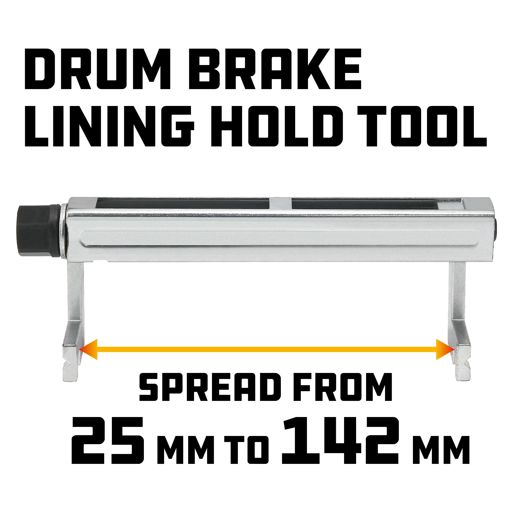 Holds the drum brake lining in place when removing the brake cylinder. Normally when doing this service with this tool the lining must be removed when replacing the cylinder. This new holding tool from Powerbuilt eliminates the need to remove the lining during this job.