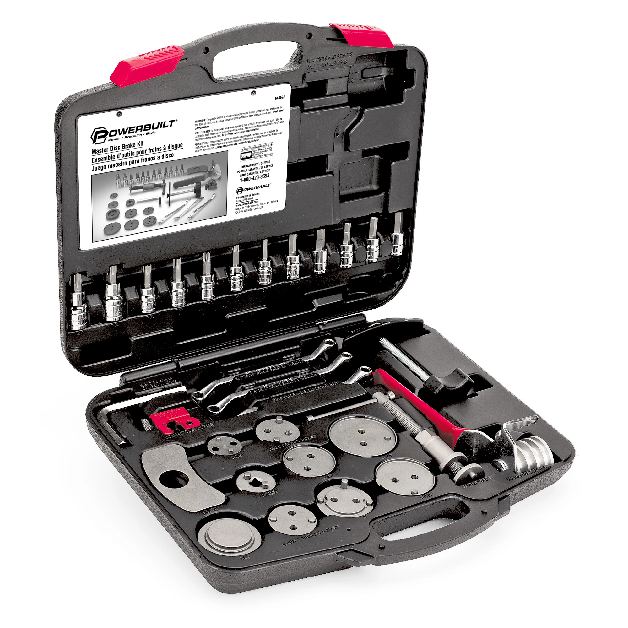 Brake servicing made easy with this innovative Master Disc Brake Set. Whether it’s your first brake service or you are an expert, this is the brake set for you. This comprehensive disc brake servicing set is 48 pieces of top quality tools to correctly and safely perform front and rear caliper adjustment, resetting piston positions with the largest caliper press tool available, line bending, and end cutting for most domestic and foreign vehicles. Everything you will need and more for a brake service is included, brake bleeder wrenches, caliper wrench, pad spreader, deluxe tubing bender, compact tubing cutter, prongs, bits, star sockets, pad, plate, T-handle, and various adapters. To make sure the job goes smoothly a set of comprehensive step-by-step instructions and usage photos are included in the rugged heavy-duty carrying case.