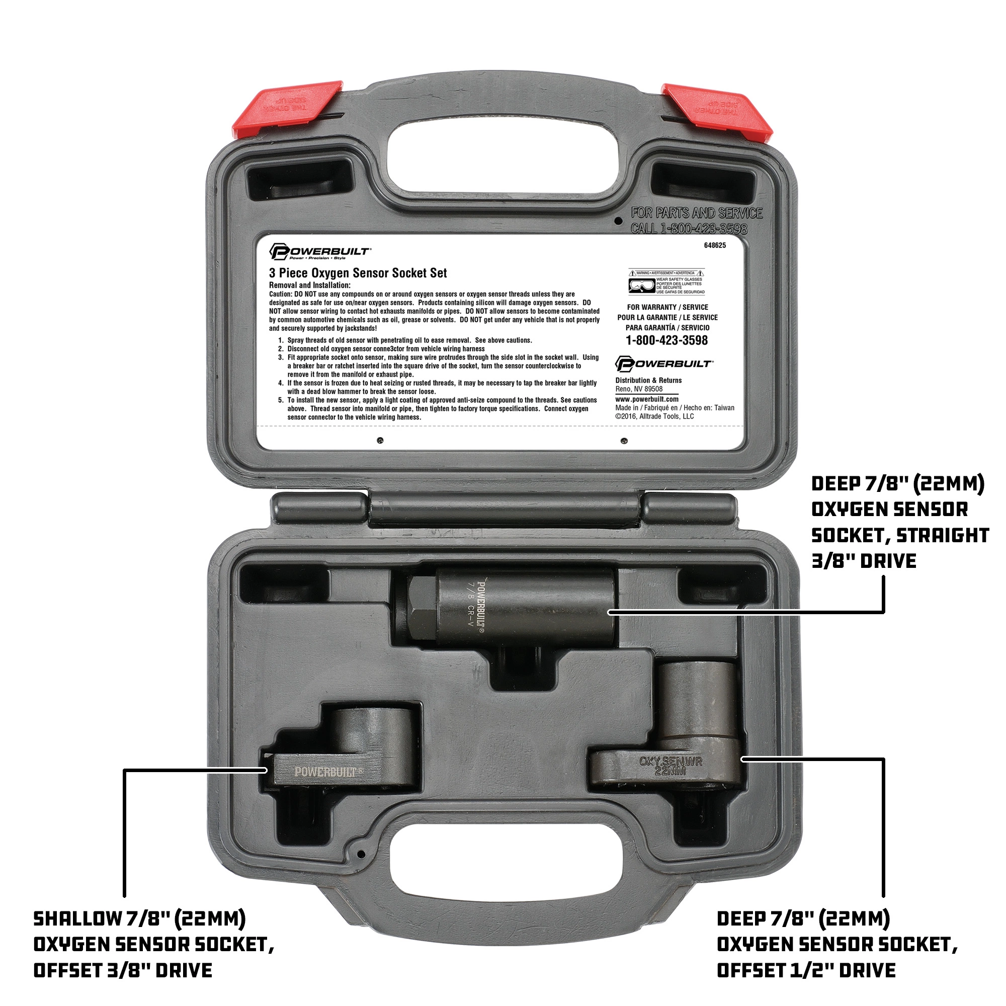 Sometimes oxygen sensors can be difficult to reach with just a wrench. They are too deep inside the engine, the wires get in the way, they are set at an angle a wrench can’t get near. This set solves those problems with three different oxygen sensor sockets perfect for every situation. The shallow 7/8” (22mm) socket is offset to make turning easier. The other two are deep, one straight, one offset, to reach sensors out of reach of other sockets. The deep socket can also be used to extract many common vacuum switches. All three have a slot to allow wiring or vacuum nipples to extend outside the socket wall. Strong and dependable enough to last a lifetime. Kit Services: many domestic and foreign vehicles Any specialty tool will help make an automotive repair or maintenance task easier, but Powerbuilt automotive installer tools take the concept of ‘help’ a big step further. It starts with the storage case – a heavy-duty design ensures it will stand up to years of use and abuse. Inside the case lid, you’ll find how-to instructions and photos that show step-by-step usage instructions. The finishing touch? All Powerbuilt installer kits meet or exceed ANSI and/or ASME standards so you can buy with confidence knowing you’ll get quality.