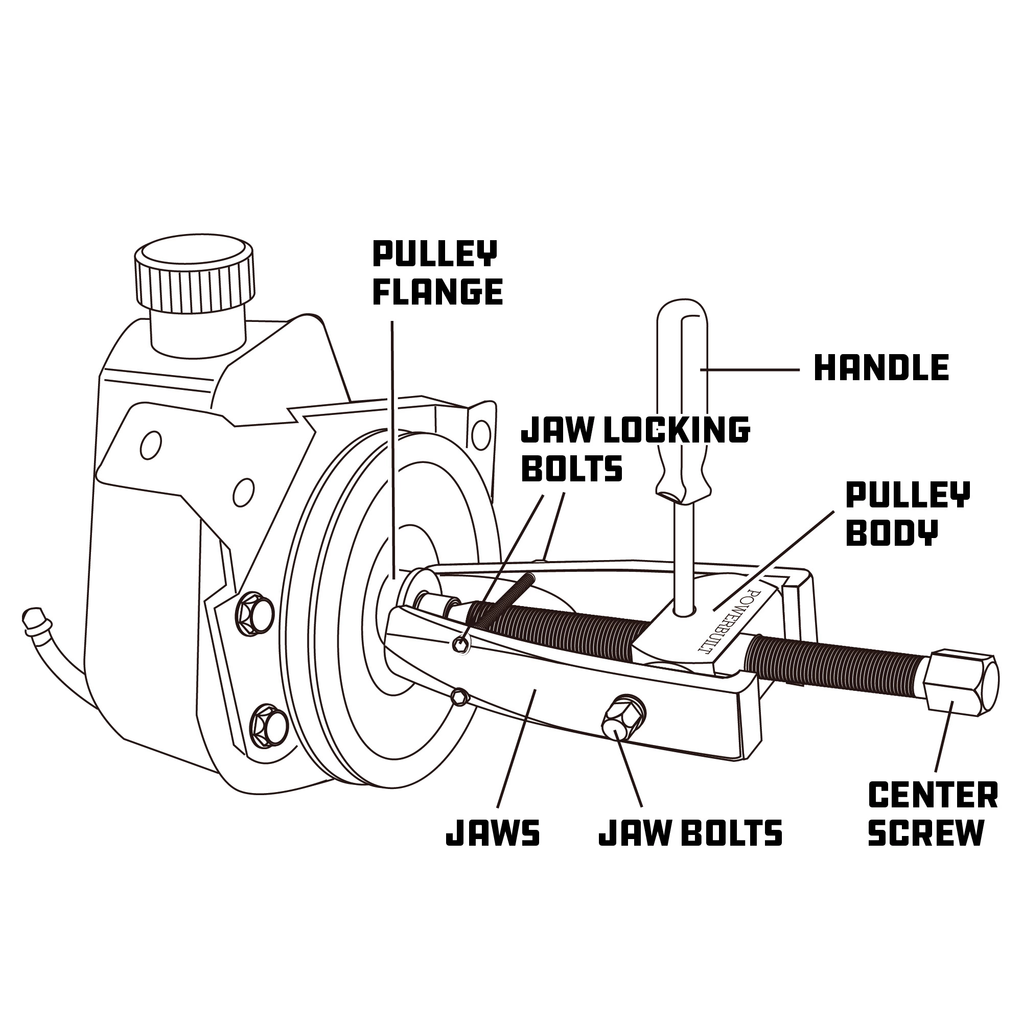 For Removing Most Power Steering Pump Pulleys. Jaws Lock Securely Over Power Steering Pump Flange For A Positive Pull. Side Thumb Screws Lock Jaws In Place. Storage Case Complete With Laminated Instruction Sheets With Photos. Patent Pending.